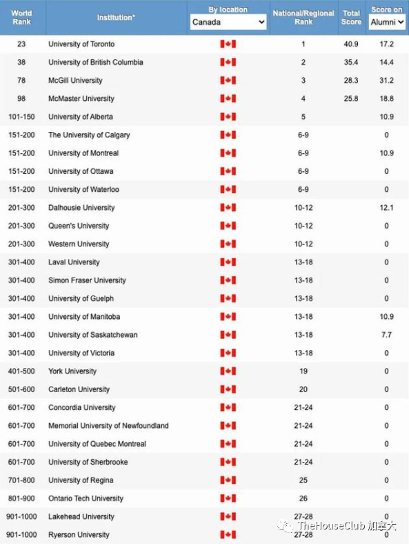 多伦多大学University of Toronto名列世界第23位,为加拿大第一;BC省的哥伦比亚大学位列第38名。