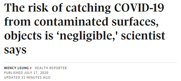 因此,Dr. Goldman陷入了思考,到底有没有必要这么做呢?在深入研究了有关新冠病毒传播的科学文献后,他认为可以证实:触摸受到病毒污染的物体表面(科学家称之为传染媒介,fomites),导致感染新冠病毒的风险,是可以忽略不计的(negligible)。